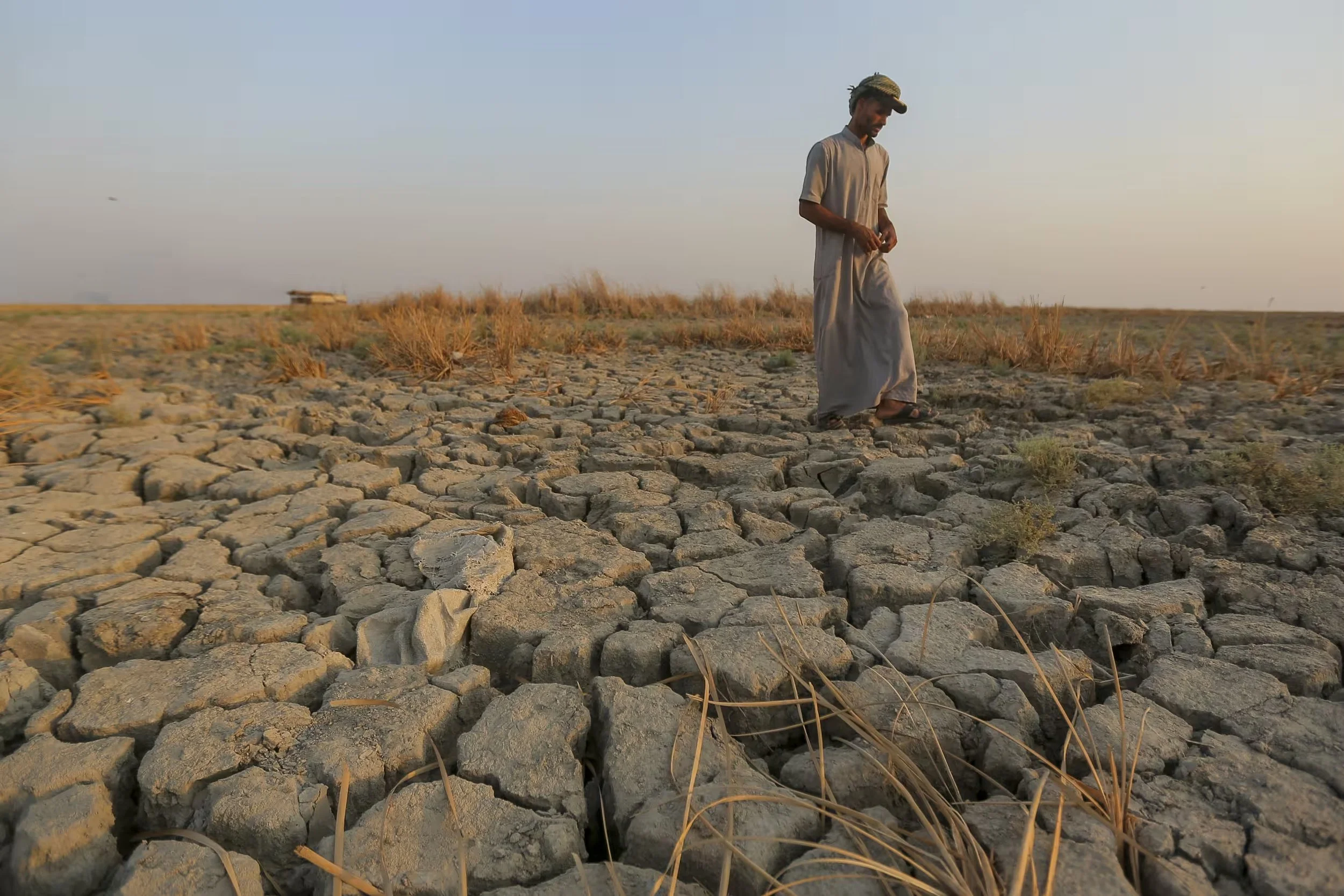 A fisherman walks across a dry patch of land after drought in the marshes of southern Iraq, Dhi Qar province. Credit: Associated Press / Alamy Stock Photo.