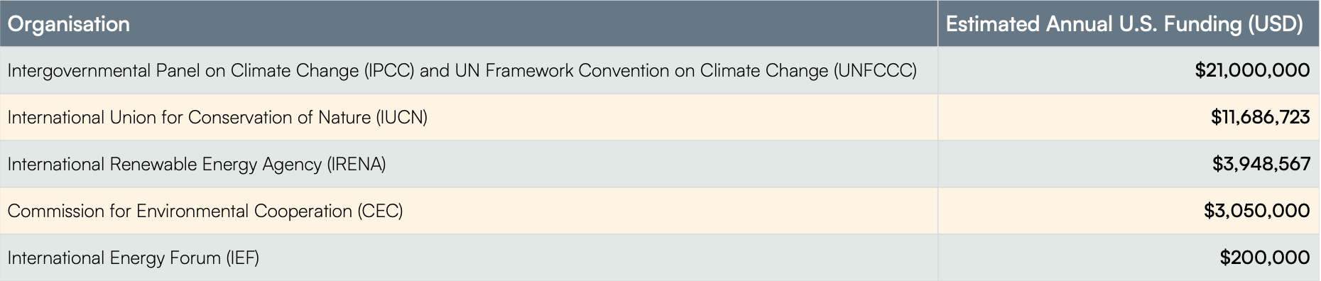 US funding for the international organizations listed in the memorandum represents a minor share of the federal budget, see Figure 2. Yet, the implications of the cuts for jobs, climate research and the continuation of mitigation and adaptation projects are severe. The decision comes less than a year after spending reductions implemented by the Department of Government Efficiency (DOGE), which resulted in the cancellation of almost 10% of global climate finance during cuts to USAID programs. During that period, 98% of USAID awards that included climate elements were cancelled, resulting in a climate finance deficit of approximately USD 11 billion per year.